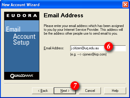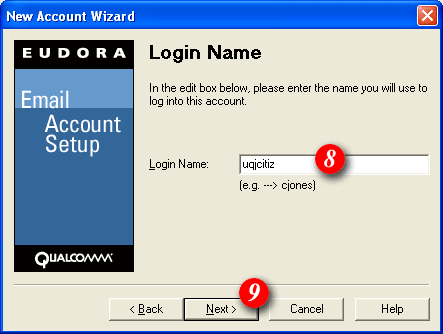 | 8)By default Eudora will enter part of your email address as the username. Delete this information and enter your 'email address' (for example: me@mydomain.com). | ||