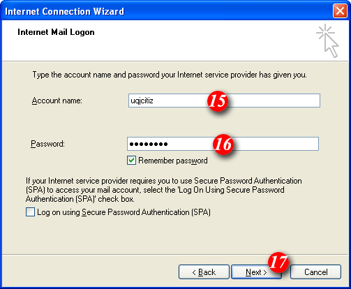 | 15)By default Outlook 2000 will enter part of your email address as the username. Delete this information and enter your 'email address' (for example: me@mydomain.com). | |||||