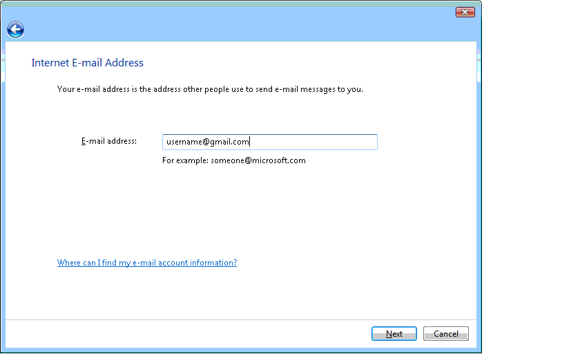 | 3) Enter your complete e-mail address, and click Next. |