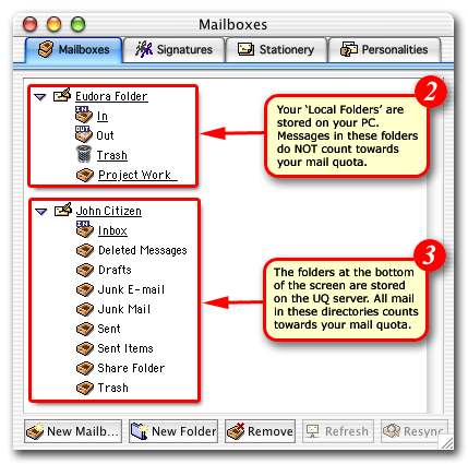| 3)The folders at the bottom-left contain all your server-based mail. Messages in these folders contribute to your mail quota. As you have a fixed amount of space on the server it is important to monitor the amount of mail in these directories to ensure your account does not go.'Over Quota'. A go.d rule of thumb is to move any messages that are more than a month old to your local folders group. For assistance transferring mail please read below. |