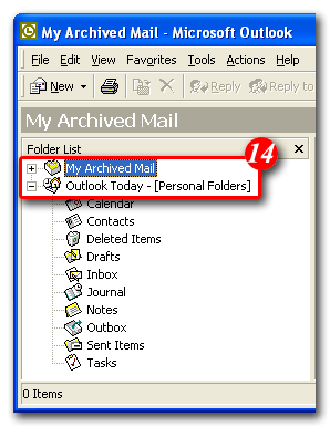 | 14)Outlook will now return to the main screen and your personal folder will be visible in the folders list on the left. (Note: this example now shows two personal folders - The original 'Personal Folders' that was present at the start of the exercise, and a new 'My Archived Mail' folder that was just created) You can setup as many personal folders as you need to manage your mail effectively. Most people find that one personal folder with a number of sub-folders underneath it is the best way to go. For assistance creating sub-folders please click here. |