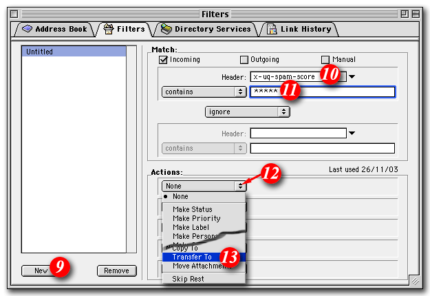 For example, if you wanted to consider anything with a score of 3 or more to be spam, the rule would look like: 'X-SpamDetect: ***'. Decreasing the number of asterisks will result in classifying more e-mails as spam. You may need to check your spam folder more carefully for non-spam e-mails that might have been classified as spam. If you wanted to rate anything with a score of 8 or greater as spam, the rule would look like: 'X-SpamDetect: ********'. Increasing the number of asterisks may result in fewer filtered e-mails being classified as spam and more potential spam staying in your Inbox.