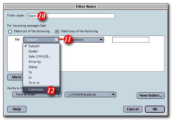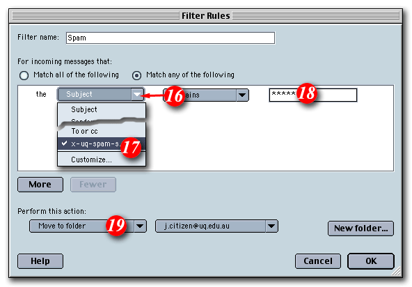 For example, if you wanted to consider anything with a score of 3 or more to be spam, the rule would look like: 'X-SpamDetect: ***'. Decreasing the number of asterisks will result in classifying more e-mails as spam. You may need to check your spam folder more carefully for non-spam e-mails that might have been classified as spam. If you wanted to rate anything with a score of 8 or greater as spam, the rule would look like: 'X-SpamDetect: ********'. Increasing the number of asterisks may result in fewer filtered e-mails being classified as spam and more potential spam staying in your Inbox.