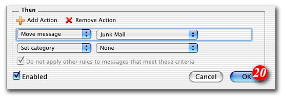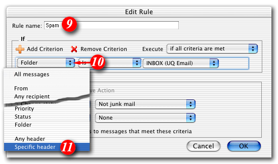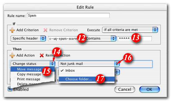 For example, if you wanted to consider anything with a score of 3 or more to be spam, the rule would look like: 'X-SpamDetect: ***'. Decreasing the number of asterisks will result in classifying more e-mails as spam. You may need to check your spam folder more carefully for non-spam e-mails that might have been classified as spam. If you wanted to rate anything with a score of 8 or greater as spam, the rule would look like: 'X-SpamDetect: ********'. Increasing the number of asterisks may result in fewer filtered e-mails being classified as spam and more potential spam staying in your Inbox.
